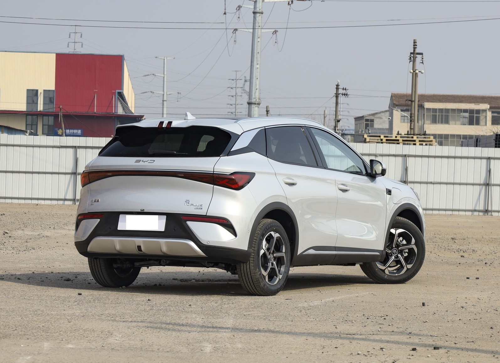 我们首先来看新车的外观设计方面,新车的采用比亚迪Dragon Face 3.0设计语言,融合了运动化与电动化的设计元素,整体造型充满活力与科技感,前脸设计符合新能源车型的设计理念,封闭式格栅搭配贯穿式镀铬饰条,中央镶嵌“元”字LOGO,这是比亚迪新能源车型的家族式设计,两侧LED大灯组造型犀利,内部采用“龙晶”设计元素,点亮后极具辨识度,与镀铬饰条连接形成了贯穿式的造型来增加视觉宽度,前保险杠两侧加入导流槽设计,优化空气动力学性能,内侧还有着黑色饰条连接中央宽厚的熏黑进气格栅,整体的运动感还是很浓郁的。