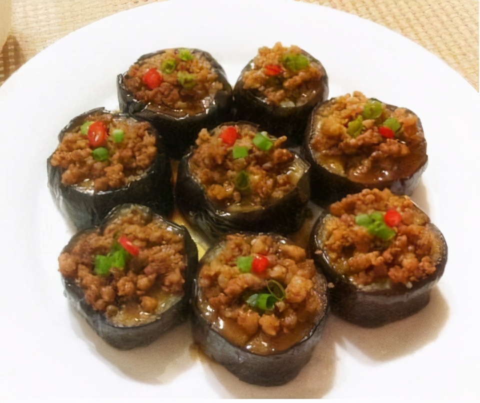 蒸熟的茄子放在另一个盘子里,把肉末放在茄子外表