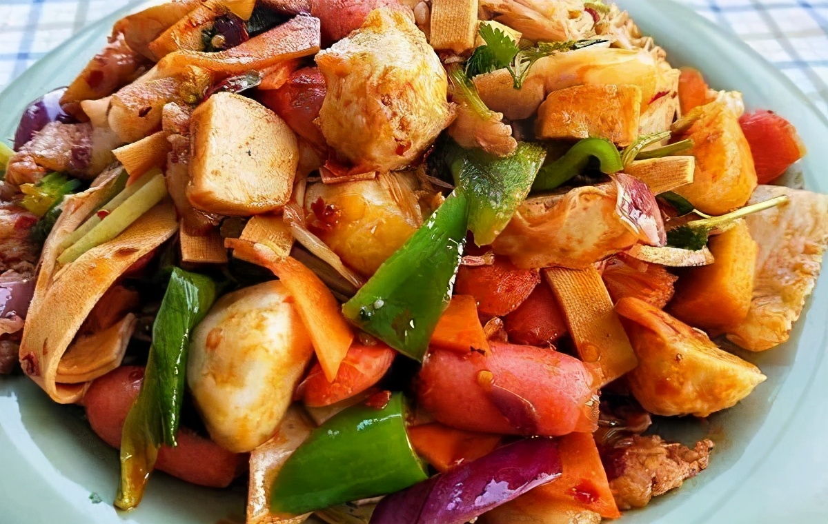 3.锅留底油放入葱姜蒜干辣椒炒出香味,下入蘑菇青红椒韭菜段,加入盐,鸡精,十三香,酱油,耗油,大火翻炒均匀淋入水淀粉勾芡即可出锅