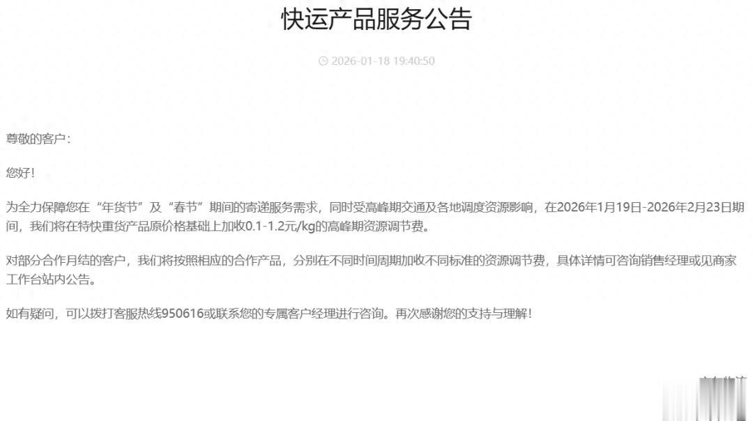 年关将至,快递行业的“春节服务大战”再度拉开帷幕。京东物流与顺丰速运相继发布公告,宣布2026年春节期间“不打烊”,同时加收高峰期资源调节费以应对运力压力;而壹米滴答、顺心快运(顺丰集团旗下)则选择暂停揽派业务,让员工享受完整假期。这两种截然不同的决策,不仅折射出物流企业的战略考量,更引发了公众对“不打烊究竟为谁而设”以及“基层员工权益如何保障”的深度追问。