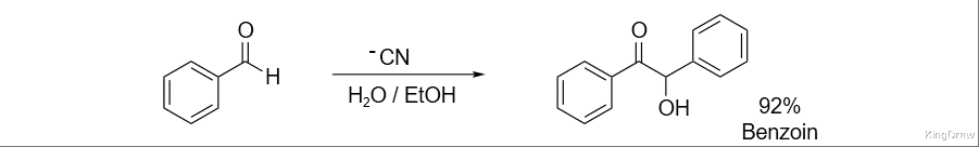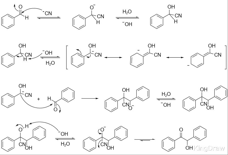 反应机理:首先是氰负离子对羰基进行亲核加成,使羰基发生极性转换,形成氰醇负离子。由于氰基不仅是良好的亲核试剂和易于离去的基团,而且具有很强的吸电子能力,所以连有氰基的碳原子上氢酸性很强,在碱性介质中立即形成氰醇碳负离子,被氰基和芳基组成的共轭体系所稳定。其次是氰醇碳负离子向另一分子的芳醛进行亲核加成,初始加成物经质子迁移后再脱去氰基,生成 α-羟基酮。该反应的限速步骤是氰醇碳负离子向另一分子芳醛进行的亲核加成反应。