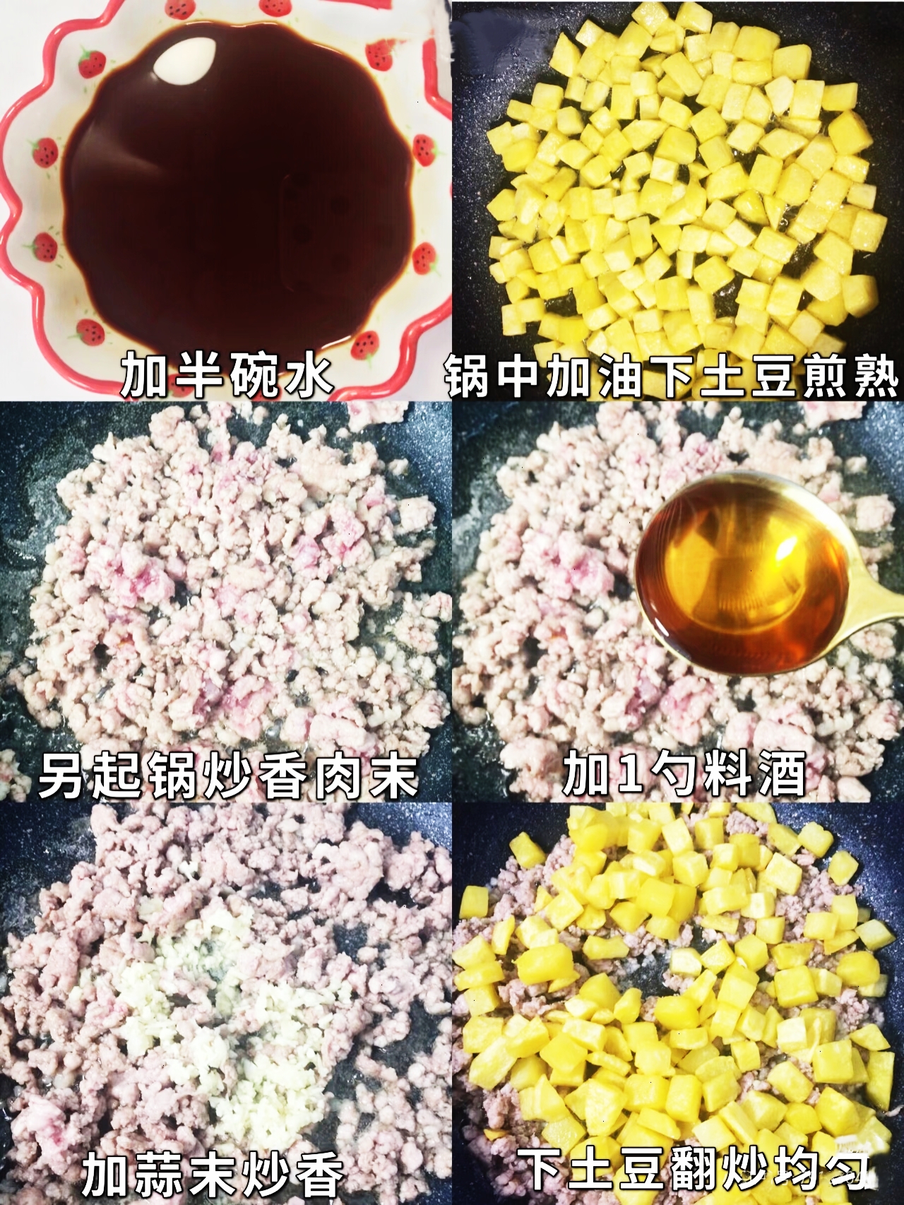另起锅倒油,油热后放入猪肉末,小火慢慢翻炒,将肉末炒散炒至变色,充分炒出肉中的油脂,吃起来才不会油腻。接着加入一勺料酒去腥增香,再放入蒜末爆香,让蒜香与肉香充分融合。随后倒入之前煎好的土豆丁,快速翻炒均匀,让每一块土豆都裹上肉香。
