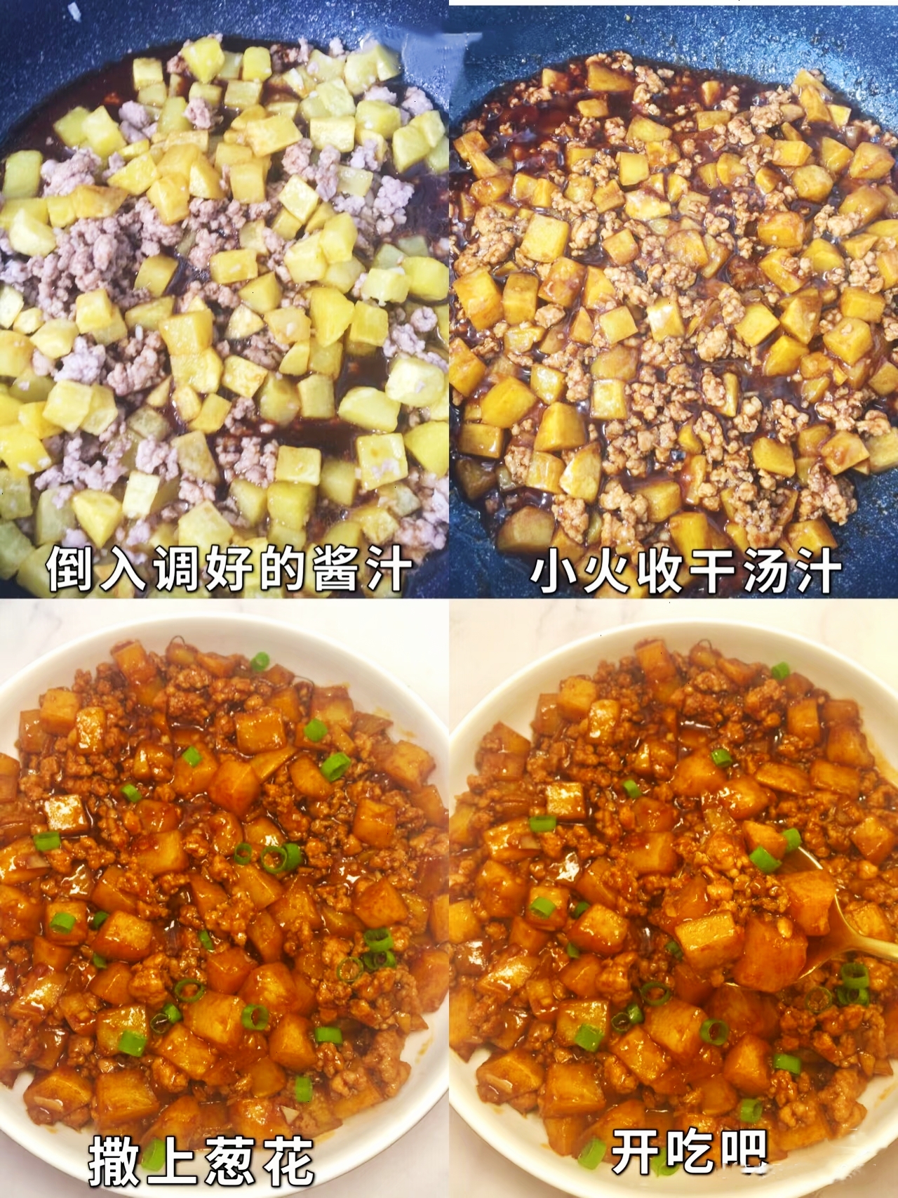 最后,将提前调好的酱汁倒入锅中,转小火慢慢翻炒,让汤汁逐渐变得浓稠,均匀地包裹在土豆和肉沫上。待汤汁收至合适的程度,撒上一把翠绿的葱花,一道色泽红亮、香气四溢的肉沫土豆丁就完成了。