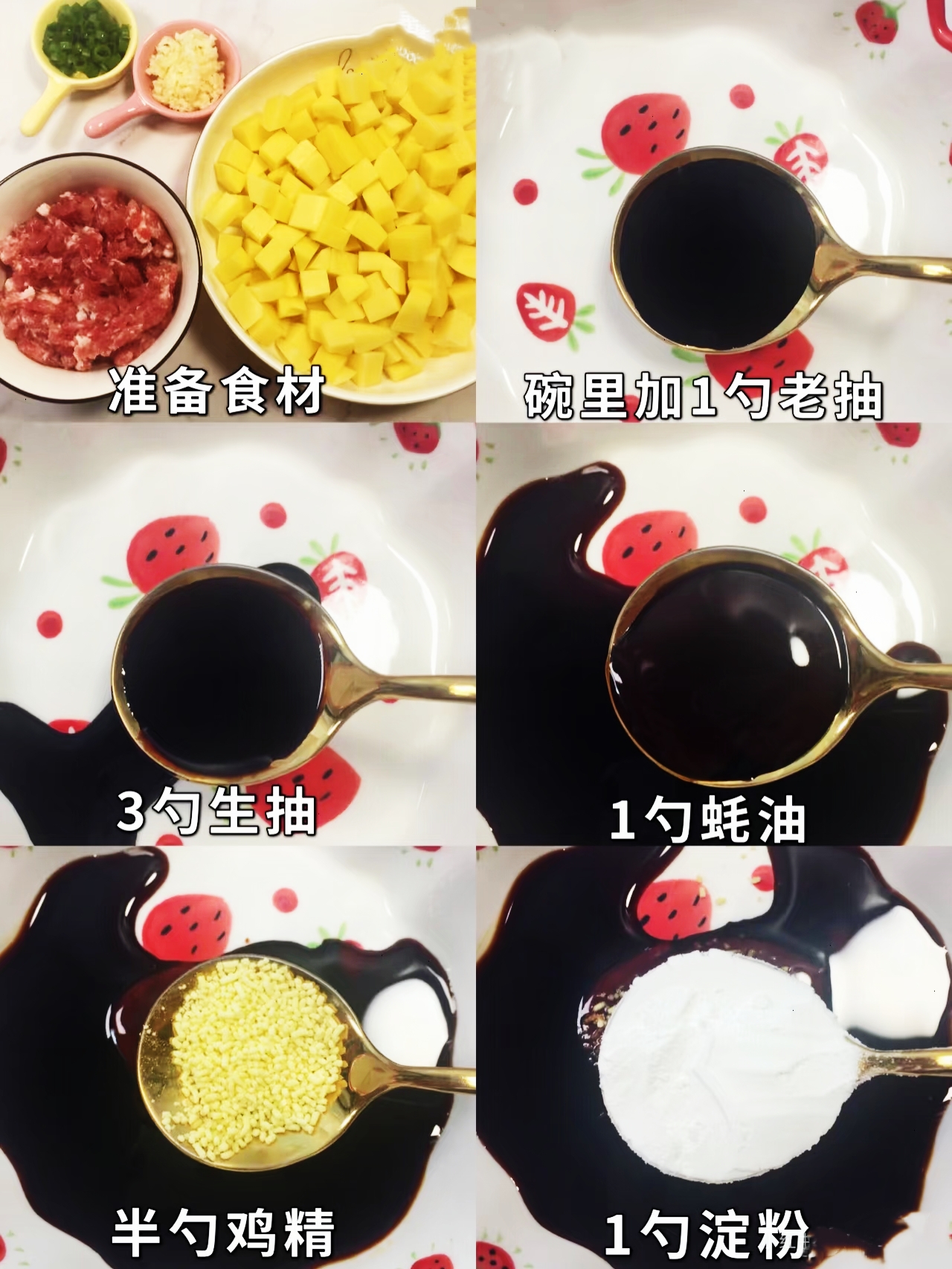 这道肉沫土豆丁,准备的食材十分家常,随手在厨房就能凑齐。需要准备土豆两个,新鲜猪肉末适量,再搭配老抽、生抽、蚝油、鸡精、淀粉、料酒提味增香,最后用蒜末和葱花丰富香气,简单的调料就能激发出最浓郁的滋味。