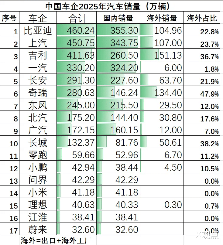 2025年,比亚迪新能源汽车销量达460万辆,连续4年位居全球新能源汽车第一;吉利控股年销量首次超过本田、日产,跻身全球前十。