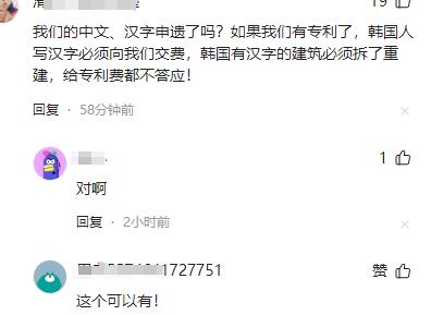 还有网友表示:“我们就应该申请中文、汉字,以后韩国人写汉字必须向我们交费,韩国有汉字的建筑必须拆了重建,给专利费都不答应!”