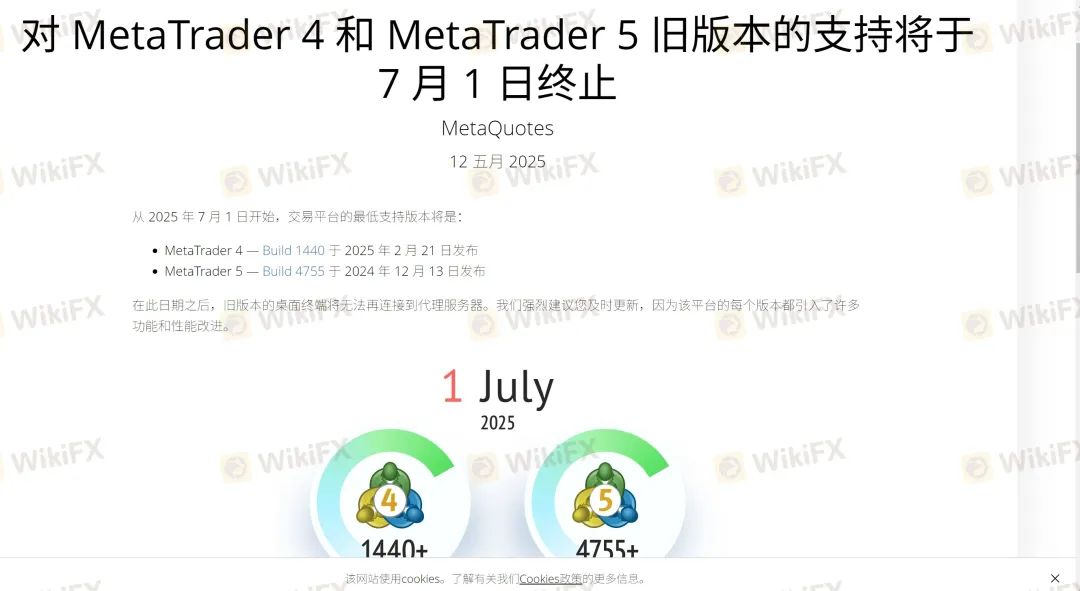 迈达克官网5月12日的公告中,已明确说明:自2025年7月1日起,旧版本MT4/MT5将被终止支持,最低版本要求为: