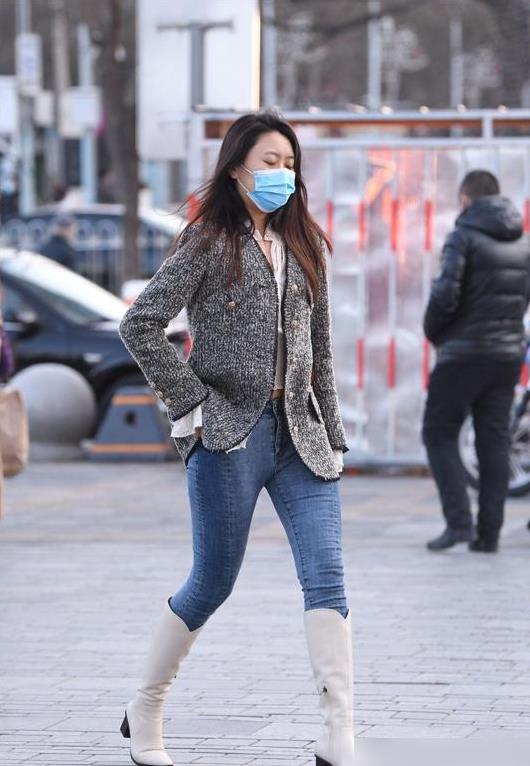 √白色靴筒搭配蓝色紧身牛仔裤,凸显魅力