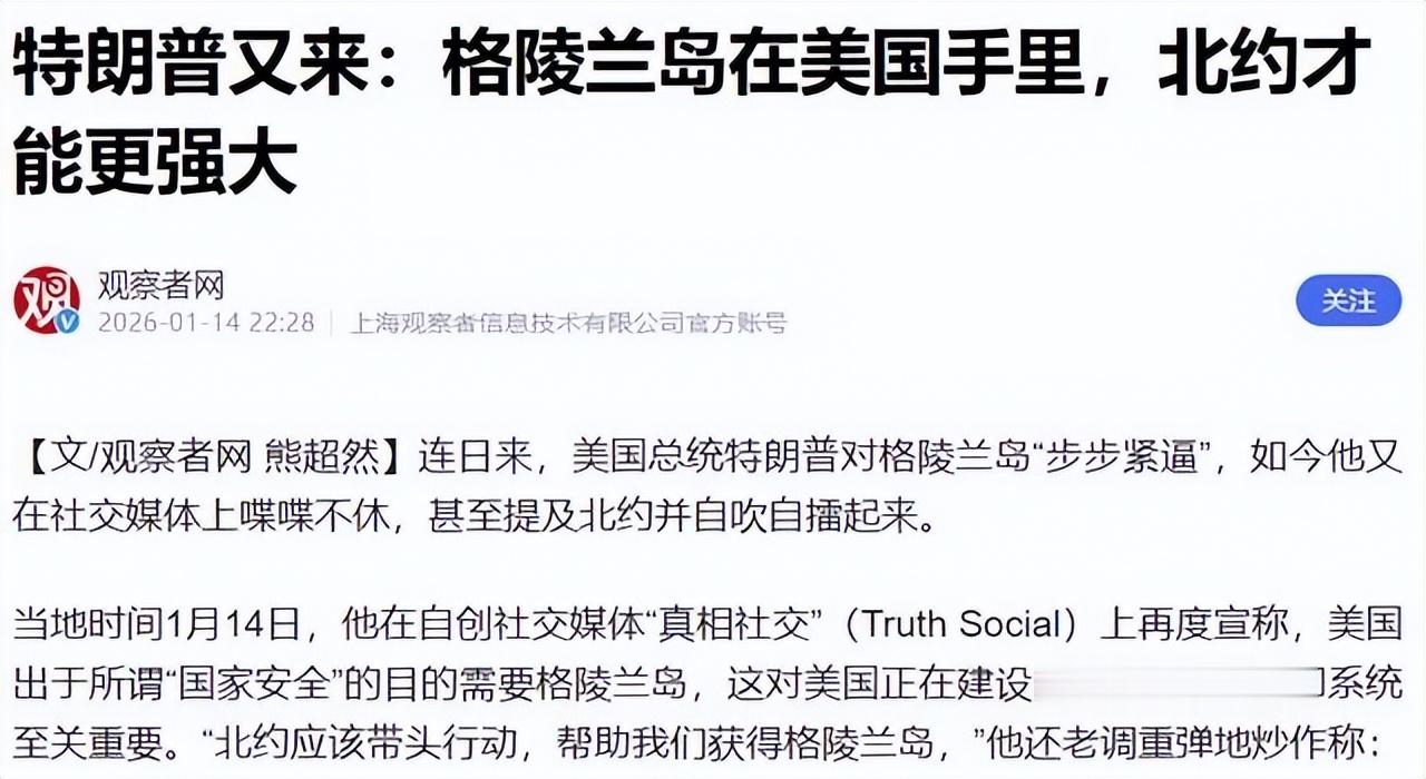 丹麦官员警告,如果来硬的,会是现代史上最无理土地抢夺,可能引发战争。北约77年历史,主要防俄罗斯,现在美国闹腾,反倒加大裂痕。特朗普在社交媒体重申必须得格陵兰,但目前没实际行动。