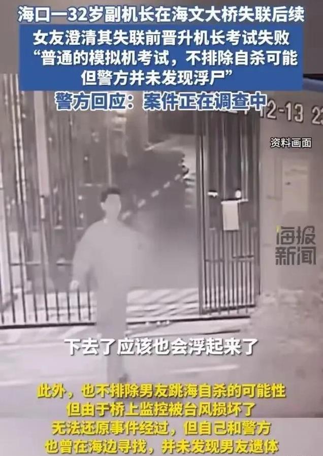 各位好奇心爆棚、爱扒事儿的老铁们!最近,坊间那可是传开了一桩超级离奇的事儿,这事儿的热度,就跟那刚出锅的热油,“噼里啪啦”地往上蹿,烧得大伙心里直痒痒,挠都挠不过来。啥事儿能有这么大动静呢?嘿,原来是海南有个 32 岁的民航飞行员,咱就叫他小孙,这人竟然在海口市的海文大桥上,神不知鬼不觉地失踪了,就跟人间蒸发似的。这消息一传开,立马像颗威力超强的炸弹,“哐当”一声,把大伙原本平静如水的日子,炸出了一圈又一圈的涟漪,每个人心里头都揣满了疑惑,忍不住想去探个究竟。