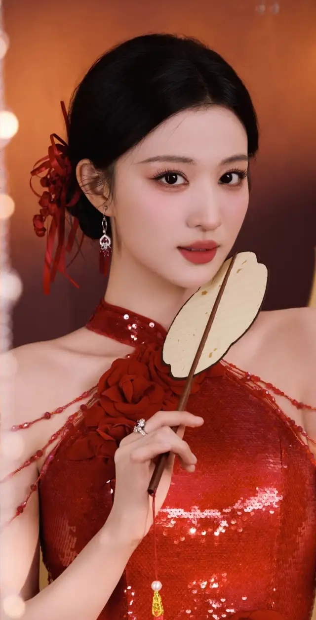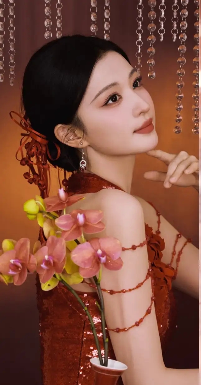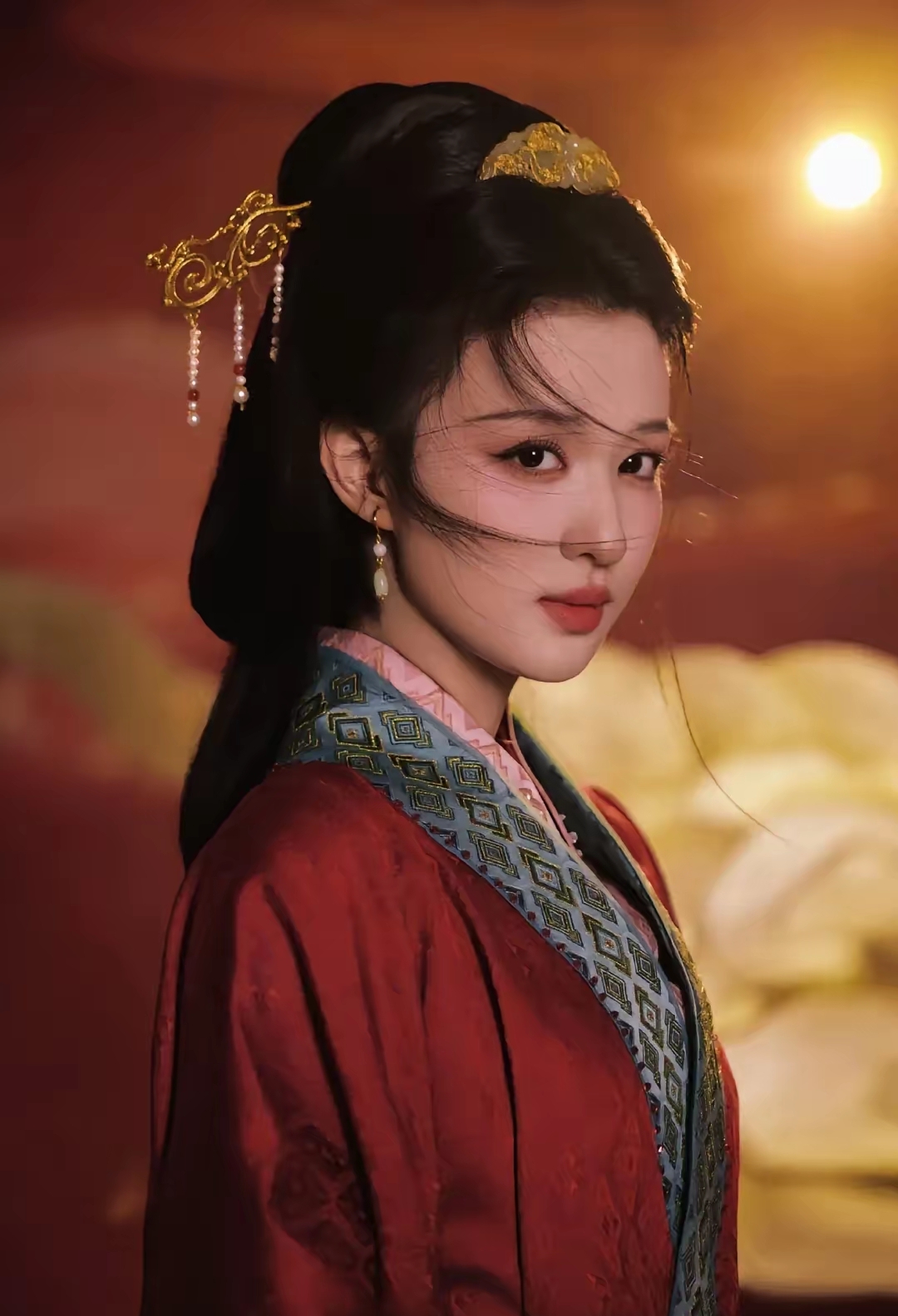 她的发髻是典雅的复古盘发,点缀着红丝带与珠串,正是湖南博物馆同款的古制发饰。精致的妆容衬得她眉眼如画,冷白的肌肤与红衣相映,无需过多言语,一位从古籍古画中走出的东方佳人已然立住。