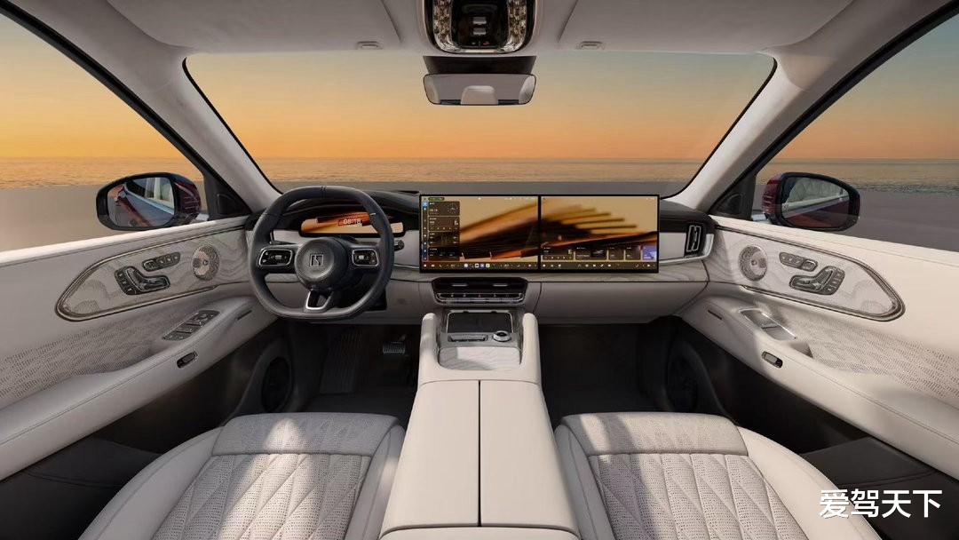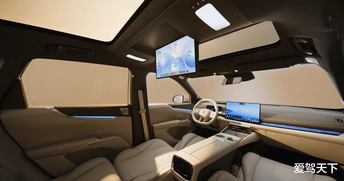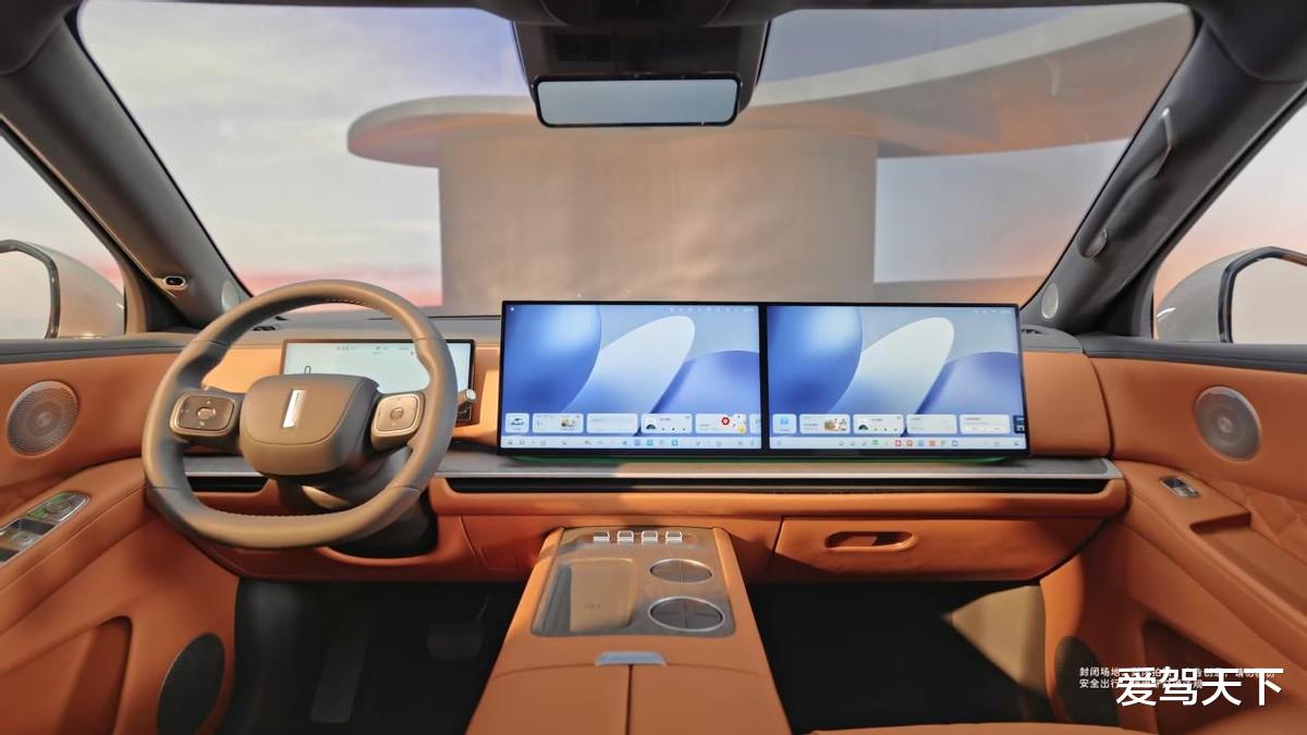 既然是奔着家庭用户去的,那“冰箱彩电大沙发”这三件套自然少不了。座舱布局也没玩什么新花样,直接用上了大家早已看腻的副驾双联屏,和自家的蓝山如出一辙,说白了就是理想L系列那一套。屏幕下方是贯穿式空调出风口,辅以不同材质的饰板,层次感倒是拉满了。