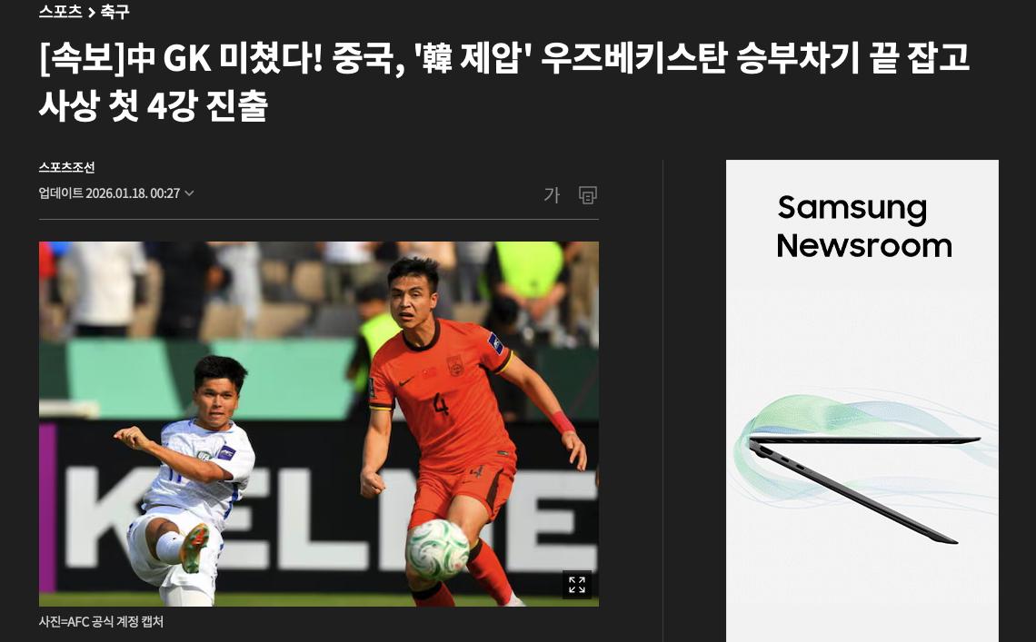 在中国队战胜乌兹别克斯坦队之后,韩国的《朝鲜日报》以“中国门将太疯狂,中国队点球大战击败韩国‘克星’乌兹别克斯坦,历史性杀进四强”为题,对本场比赛进行了报道。看到中国队爆冷晋级,韩媒也显得有些吃惊,因为在小组赛阶段,乌兹别克斯坦队曾以2-0完胜韩国队,对于他们的实力,韩媒可以说是一清二楚。然而就是这个韩国队的“克星”,却在面对中国队的严密防守时显得束手无策,最终在点球大战中意外落败,早早退出了冠军的争夺。