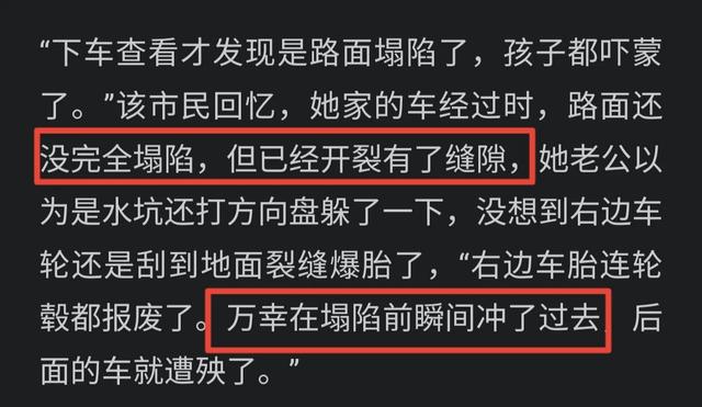 另一名女子是亲历者,塌陷发生时,她老公在前面开车,自己和孩子在后排睡觉。