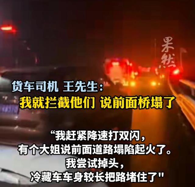 从前方撤退回来的小车那儿得知消息后,他立马打开车辆双闪,尝试掉头,用长长的车身将道路堵住,避免更多不知情的后车直冲进去。