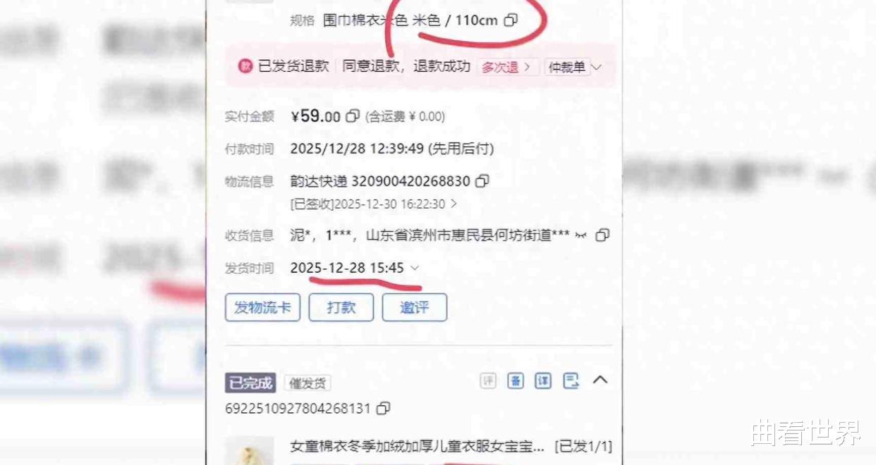 在2025年11月份王记者在这家童装店网购了一件90尺码的棉服,收到衣服后她正常穿着了一个月,到了12月底她再次下单了一件110码的同款式棉服。对于商家来说顾客连续下单同一件衣服,这无疑是一个积极的信号。商家最初还满心欢喜心想顾客对自家衣服的质量、款式肯定非常满意,才会选择再次购买。
