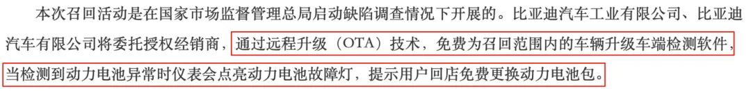金先生的担忧不无道理。根据比亚迪公布的召回方案,针对电池包一致性问题,将首先通过OTA升级为车辆安装电池检测软件,当仪表点亮故障灯提示电池异常后,用户再回店更换电池包。这种“先检测、后处理”的模式,在不少车主看来更像是一种“被动应对”。