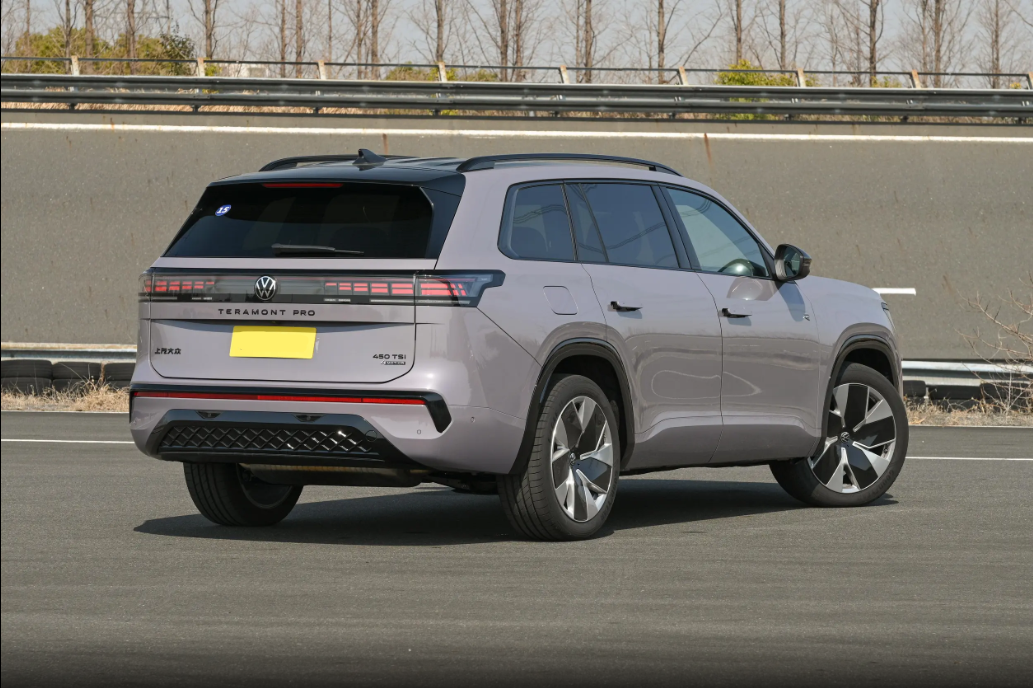 车身侧面线条更加流畅动感,削弱了老款车型方正感,此起彼伏的腰线贯穿整个车身,车顶行李架、车窗边框饰条、侧裙饰条、轮眉以及五辐式轮毂均采用黑色涂装,与运动风格形成统一,而且大众 Pro还搭载了隐藏式门把手。与此同时,车尾继续配备贯穿式尾灯组,只是尾灯光源更加简约时尚,采用多层次的阵列式光源结构,中间带有可发光的大众车标,与车头造型形成呼应。后包围黑色装饰采用网格设计,上方有红色贯穿式反光条,排气系统采用隐藏式布局,与整体风格形成统一。