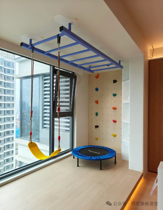 阳台空白墙做了一个攀岩墙,上方爬云梯,秋千,阳台打造成活动场地