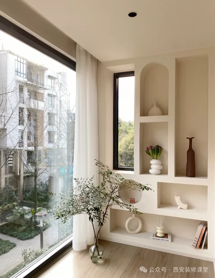 不做收纳做了壁龛造型,方形与圆弧搭配,摆上好看的摆件,空间温馨又显得高级
