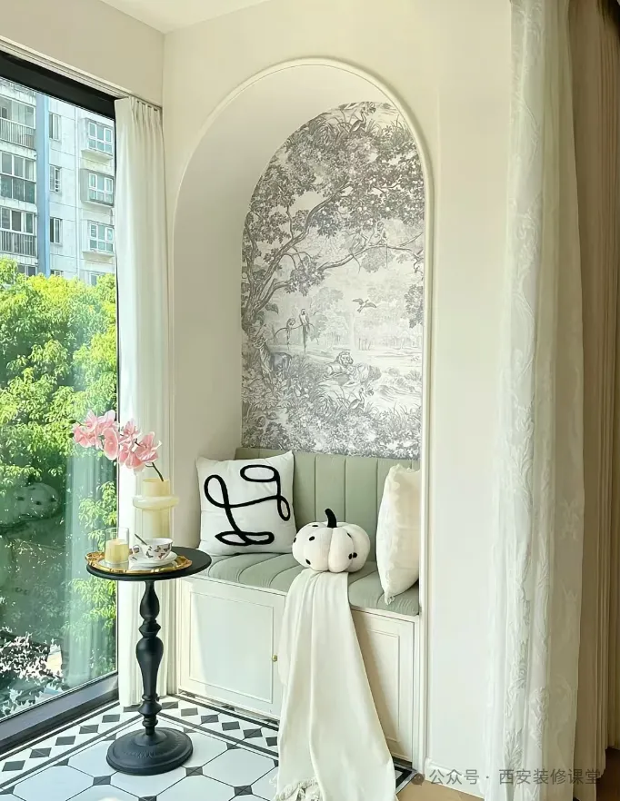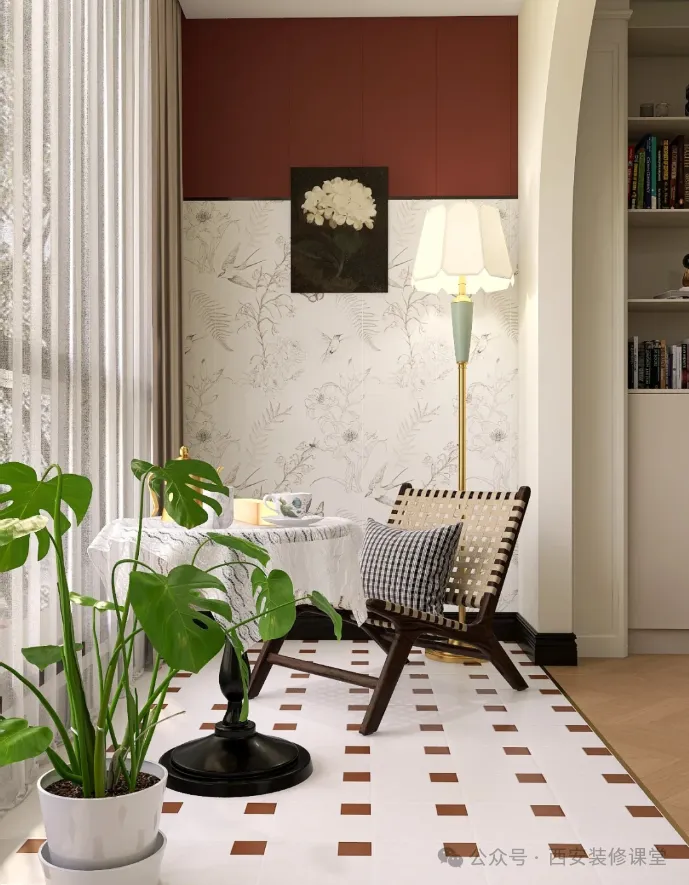 法式小花砖+精致挂画,摆上休闲椅以及落地灯,这氛围感非常高级