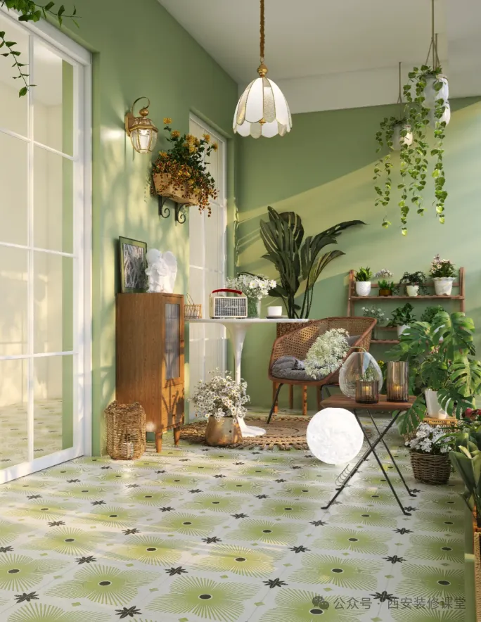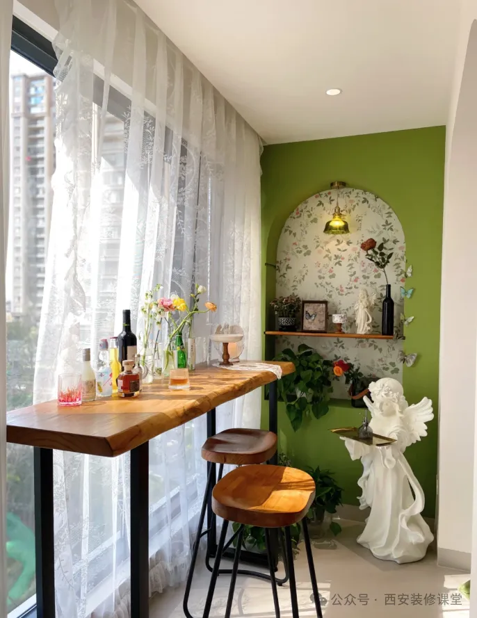 阳台墙面刷上草绿色的防水漆,摆上花架绿植,各种装饰,这里休闲赛神仙了