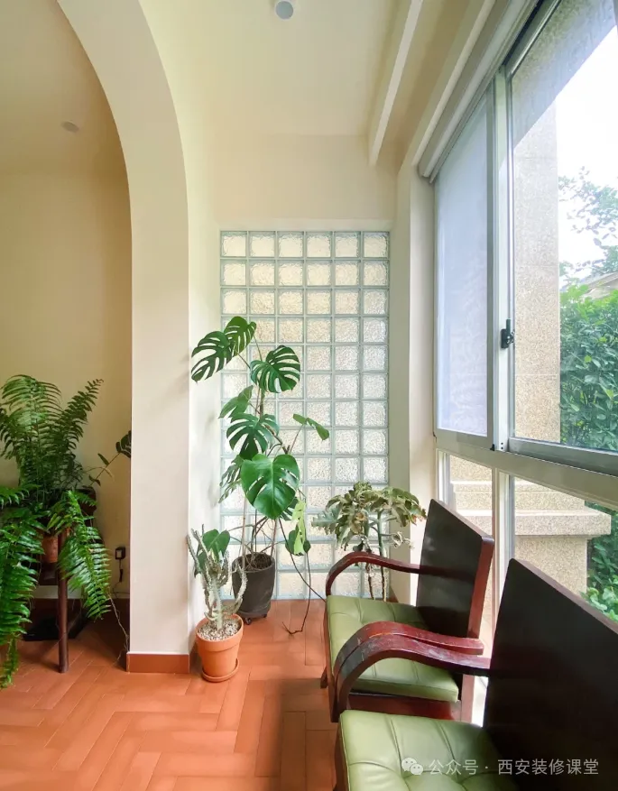 双阳台采用玻璃砖隔断分割,摆上绿植,非常有氛围感《局部玻璃砖有多神?网友实测:家里亮堂得像开了滤镜》