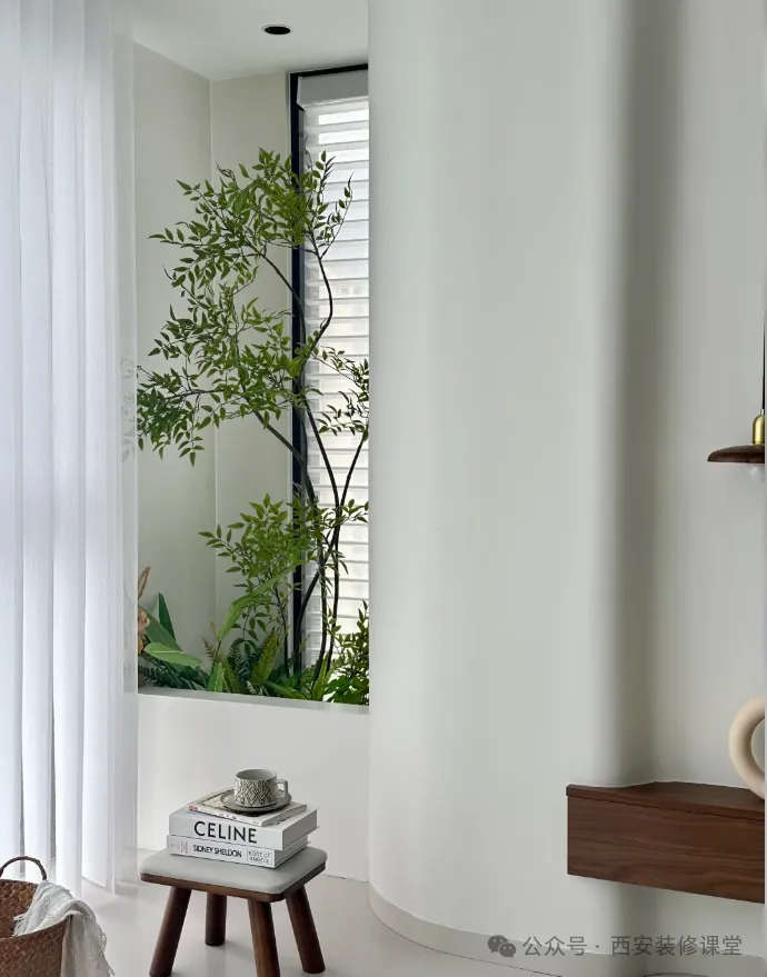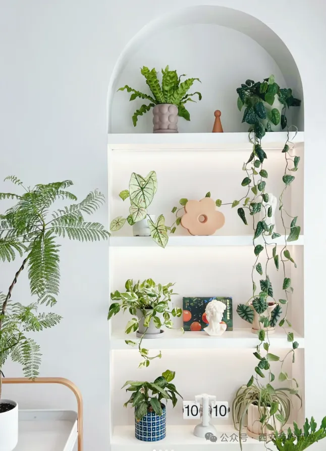 不做柜子单调,然后做个拱形壁龛,放一些绿植和摆件,加上灯光氛围,在这里休闲氛围绝绝子
