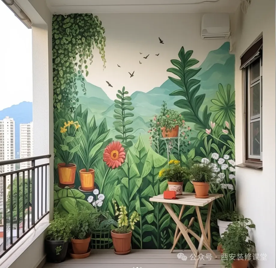 阳台一面墙绿植手绘,也可以装饰,同时满足绿意盎然