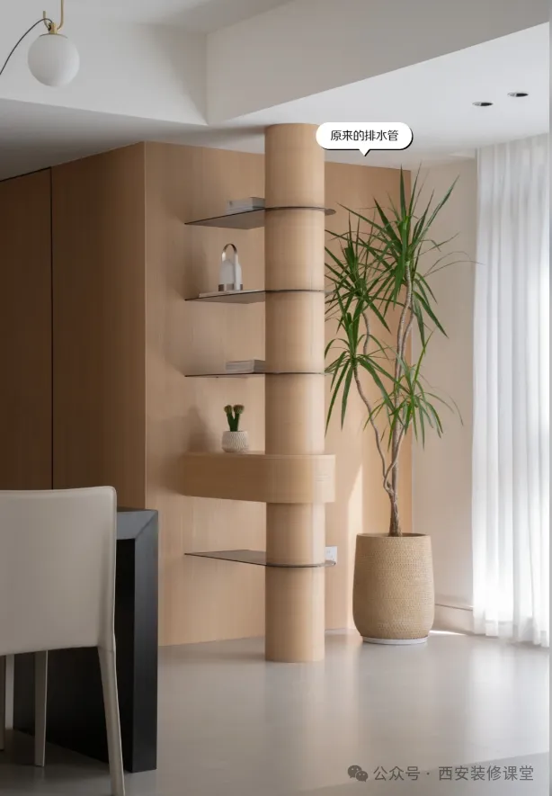 阳台纳入室内以后,采用木饰面装饰,同时借用原有的水管装饰,实现一个展示空间,搭配高大绿植,空间整体变得高级