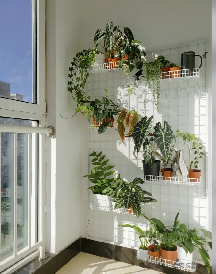 最简单的做绿植墙的方法就是洞洞板,加上隔板,可以随意调节位置,做完了绿植墙,营造阳台温馨氛围非常实用