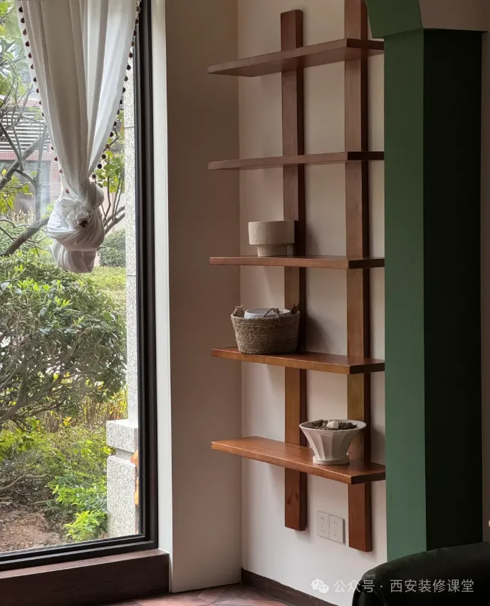 阳台不做收纳柜,空着单调,采用实木板打孔安装,实现一个中古风的博古架,放上好看的摆件,阳台一下就丰满起来,而且提升了空间的品味。