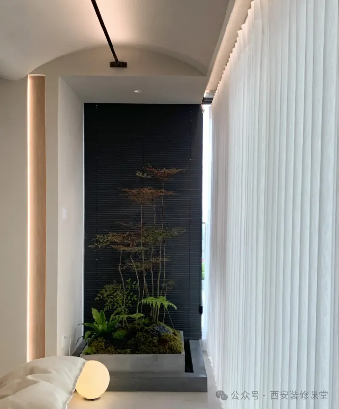 有窗户的一侧做了一个绿植景观台,刚好利用原有下水,同时采用黑色百叶遮光,颜值氛围都有了