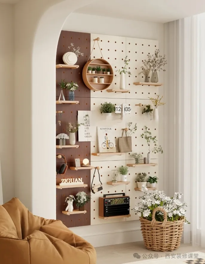墙面不同色洞洞板装饰,可以满足各种好看的摆件装饰,空间一下子有了情调