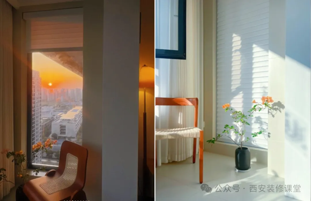 阳台一侧有窗户,也不想定制柜,干脆好看的百叶帘装饰,放把休闲椅以及绿植,夕阳西下的时候,光影简直绝了