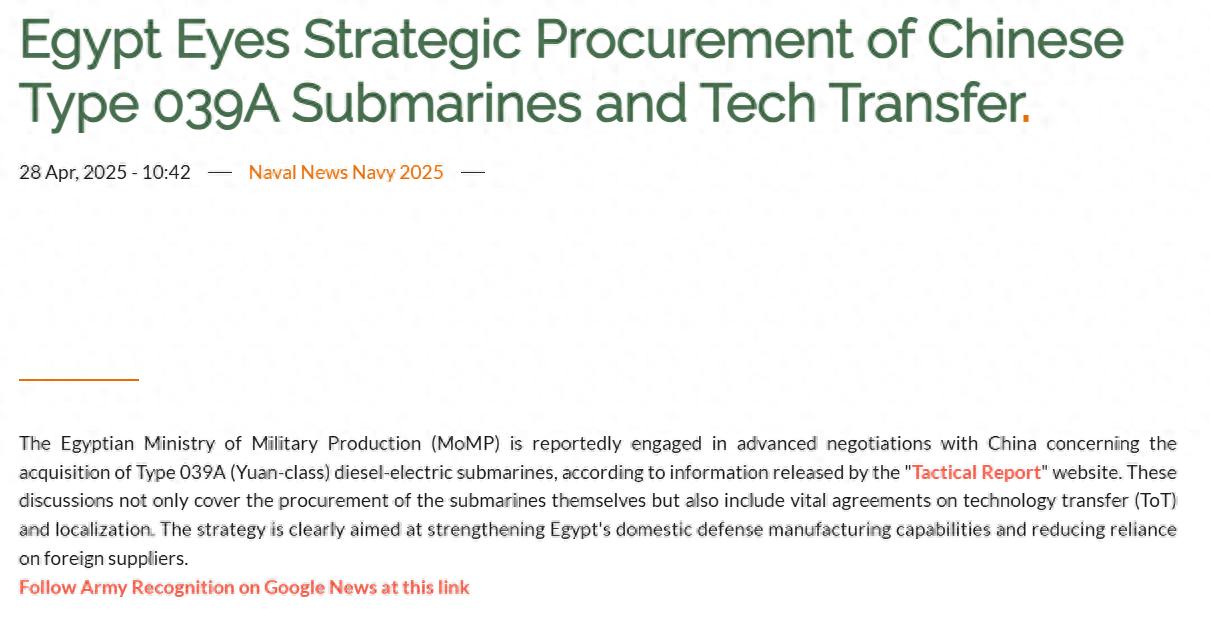 中国033型潜艇仍是埃及主力,面对以色列威胁,外贸版039A是极好的选择《global defence news》称,埃及军事生产部 (MoMP) 正在与中国就购买 039A型柴电潜艇展开高级谈判。埃及不仅考虑购买039A型潜艇,还希望达成技术转让(ToT)和本地化的合作。《global defence news》认为,埃及此举旨在加强埃及军工生产能力,并减少对外国供应商的依赖。