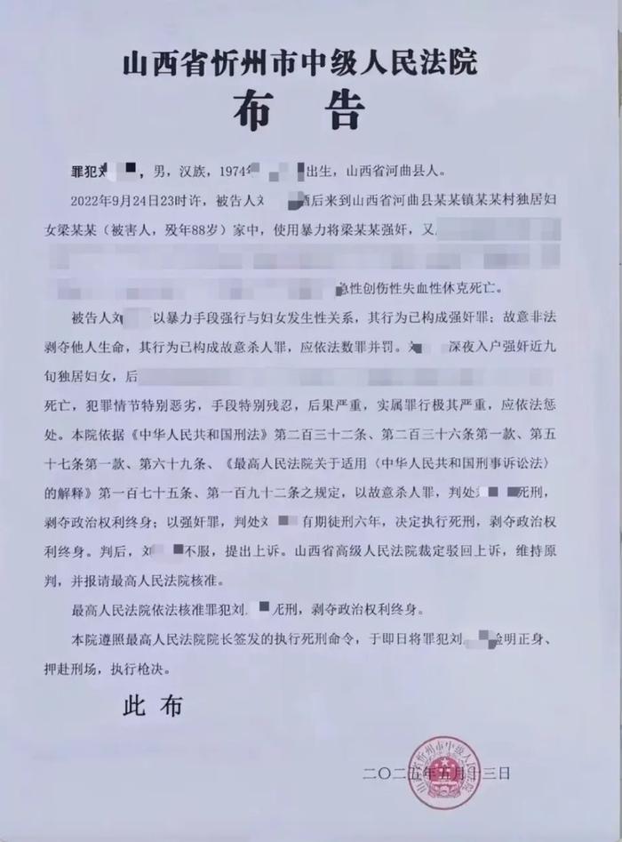 2025 年 5 月 13 日,山西省忻州市中级人民法院发布布告称,罪犯刘某奇已于当日被执行枪决。此前,刘某奇在 2022 年 9 月 24 日深夜,酒后潜入河曲县某村 88 岁独居妇女梁某某家中实施暴力强奸,并导致其死亡。