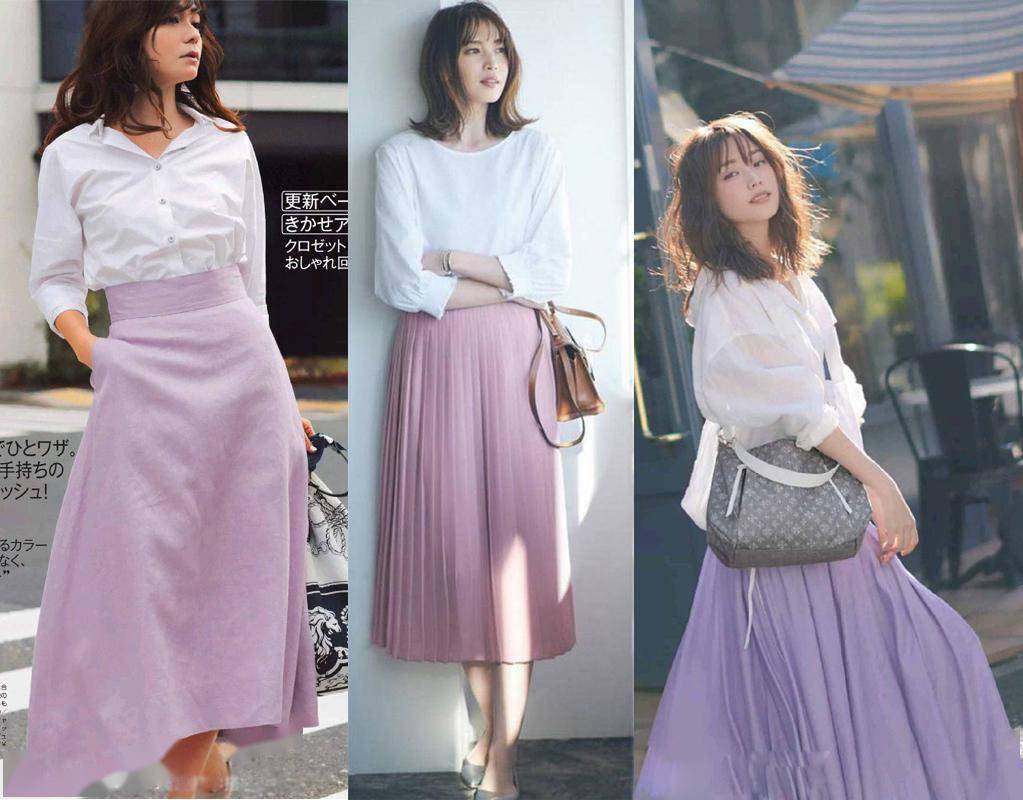 如果你有一件白色的衬衫,感觉太单调,乏味的时候,建议用一条浅紫色的半身裙来配,立马就能增添几分浪漫、优雅的氛围感。