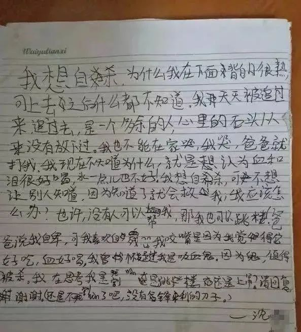 近年来,青少年自杀的事件频繁出现,例如一位14岁的上海初中生留下长达三页的遗书控诉父母后跳楼自尽;一名9岁男孩因被罚抄写一万遍错别字而不敢上学,最终选择跳楼;以及一位13岁的贵州少年因考试成绩不理想而企图跳楼轻生……