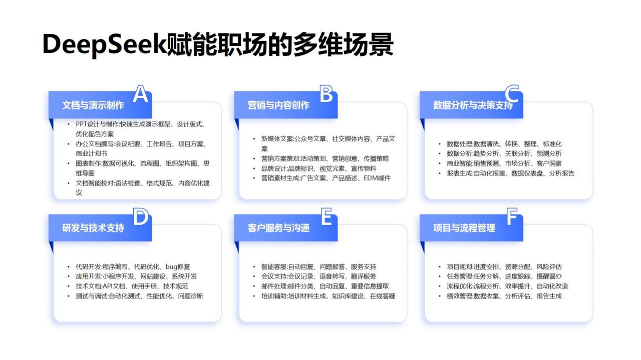 本报告由山东大学经济学院与国家治理研究院联合撰写,全面介绍了DeepSeek大模型的技术演进、应用场景与部署实践。报告回顾了生成式AI技术从早期统计语言模型,到深度学习语言模型,再到当前多模态大模型的发展历程,并重点解析了DeepSeek模型架构的技术创新,包括MoE专家混合架构、多头潜在注意力机制(MLA)、低秩KV缓存压缩等关键技术突破。特别是DeepSeek在强化学习环节引入了GRPO(Group Relative Policy Optimization)新框架,摒弃传统价值网络,直接基于评分基线进行策略优化,大幅降低训练复杂度与成本。报告还系统总结了DeepSeek在职场办公、教育科研、政务服务、金融分析等多个场景的深度应用实践,包括PPT文档生成、营销文案撰写、代码开发调试、智能客服、会议纪要整理、流程优化、数据分析与决策支持等具体案例。