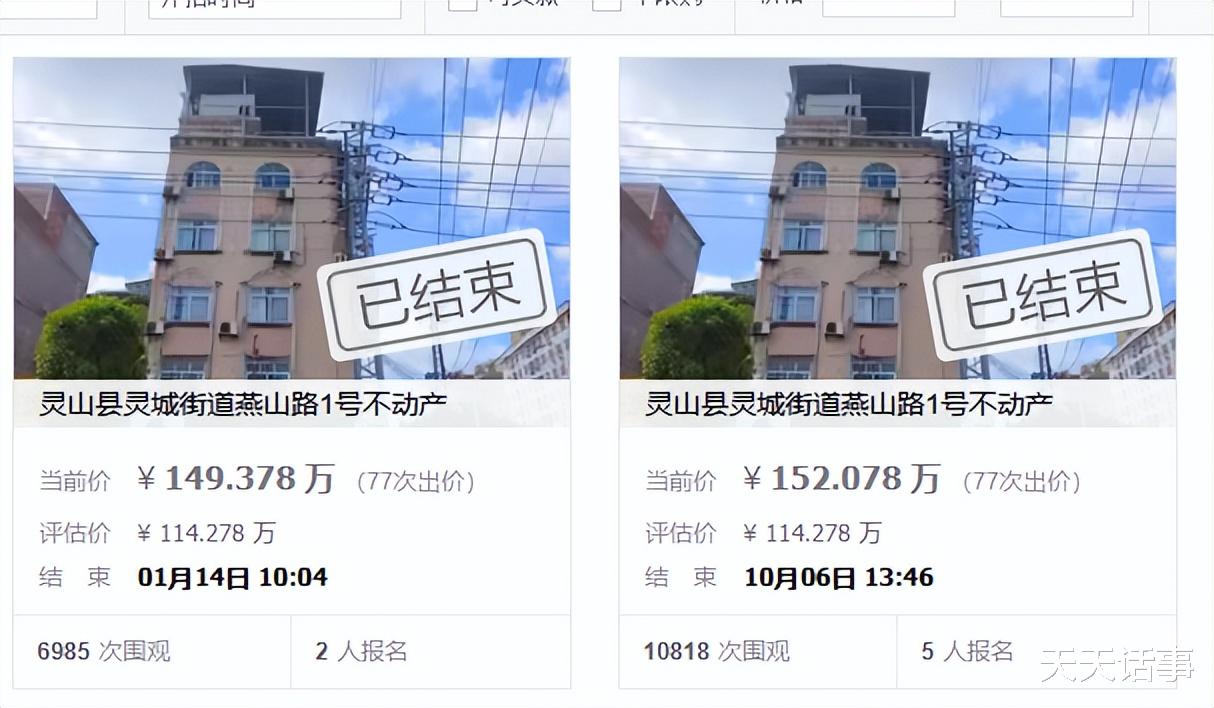 值得注意的是,此次灵山县拍卖的这栋私人楼,原房东在灵山县还有另外一栋私人楼,在去年的时候也是一起被拍卖,第一次拍卖的时候,两栋楼是被同一个人拍下的,然后都是遭遇同一个人悔拍,只不过另外一栋在重新拍卖后,没有出现流拍,又拍出了不错的价格,只是相比第一次拍卖成交价低了两万多元而已。