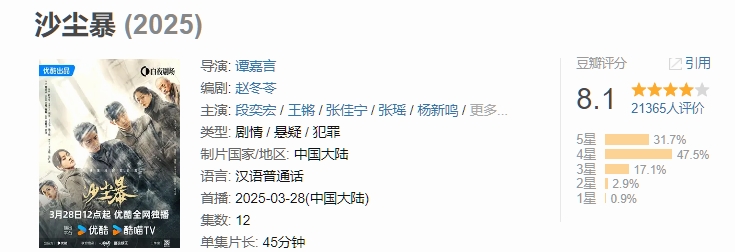 2025年春天的剧圈,被一场“沙尘暴”刮得人仰马翻。优酷独播的《沙尘暴》开分直接飙到8.1,评论区被“头皮发麻”“呼吸不畅”刷屏。谁能想到,赵冬苓首次试水悬疑短剧,就联手《警察荣誉》的导演谭嘉言,把西北荒漠拍成了悬疑剧的天花板?当三料影帝段奕宏带着《误杀3》里封神的演技,在黄沙里演活一个“破碎感刑警”,观众终于明白什么叫“剧版沉浸式吃土”:这剧连风沙颗粒都在疯狂加戏。