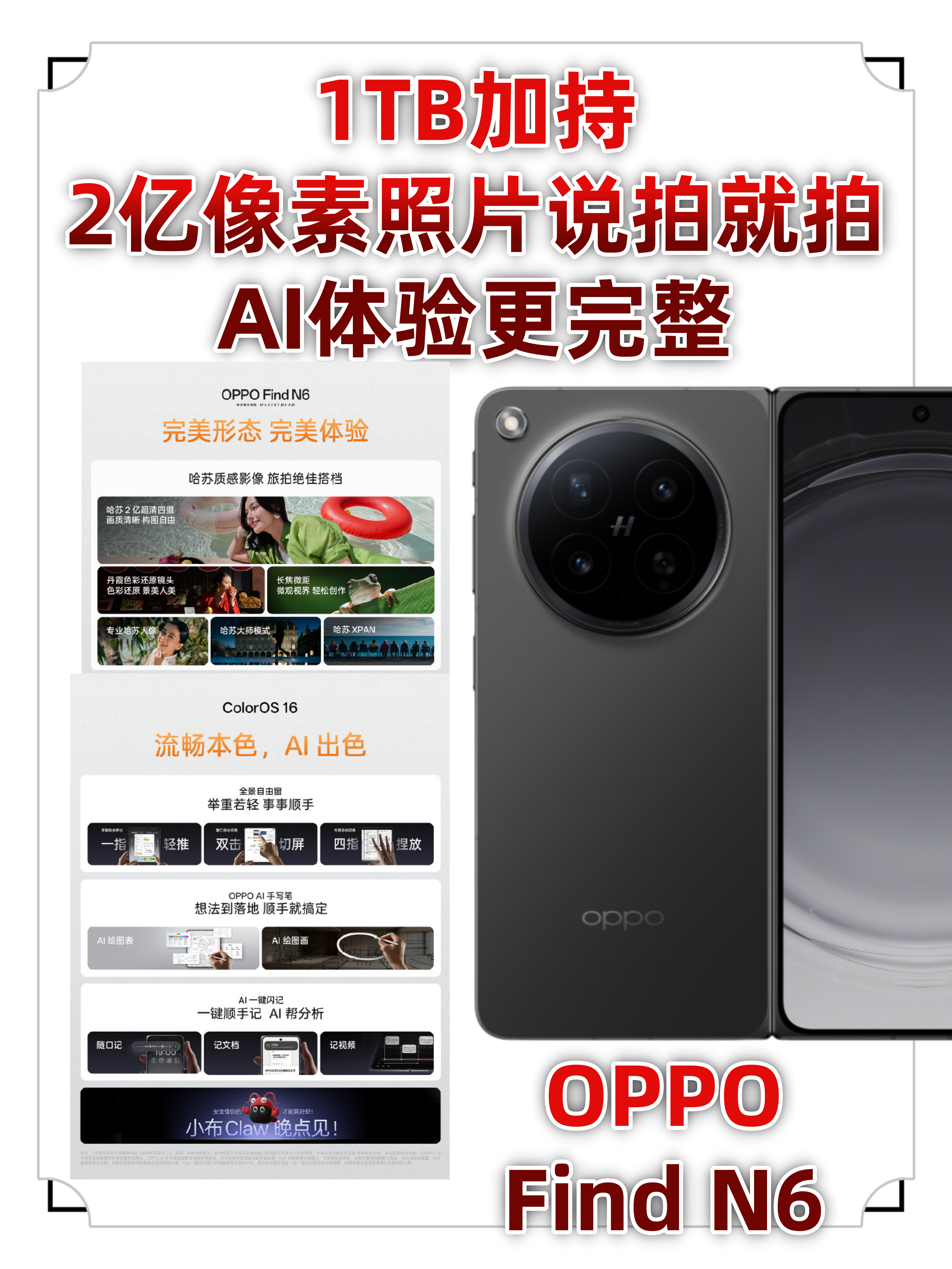 OPPO Find N6本身还自带哈苏2亿超清四摄+ColorOS提供的各种AI功能