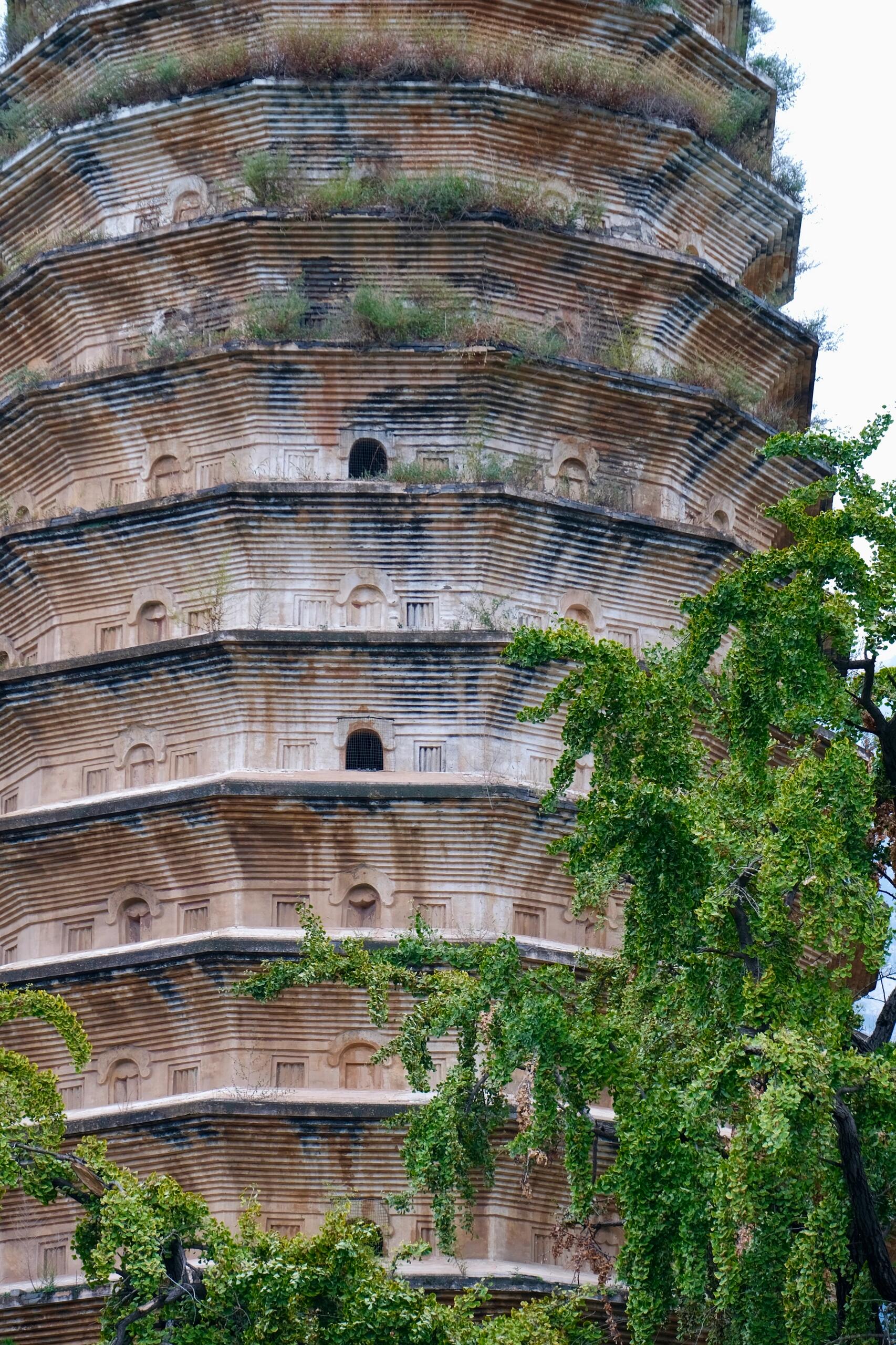 站在塔下,你能清晰地看到塔身被腰檐分成了上下两段。下段的四面开着拱门,圆拱的门楣上,还能看到些许火焰形的纹饰,那是犍陀罗艺术的影子,顺着佛教东传的路线,一路从印度走到了嵩山。其余八面则是素面的壁龛,转角处立着八角形的倚柱,简单的线条,却撑起了整个塔身的敦实感。上段的装饰稍多一些,密檐之间的矮壁上,砌了四百九十二个小窗,有的是真的,能透进风来,给空心的塔室换气采光;有的只是装饰,纯粹为了打破墙面的单调。这些窗子密密麻麻,却排列得极有章法,和层层向内收缩的密檐搭配在一起,让整座塔的轮廓线,呈现出一种柔和的弧度,像抛物线一样,从底座缓缓向上收束,最后落在塔顶的宝刹上。