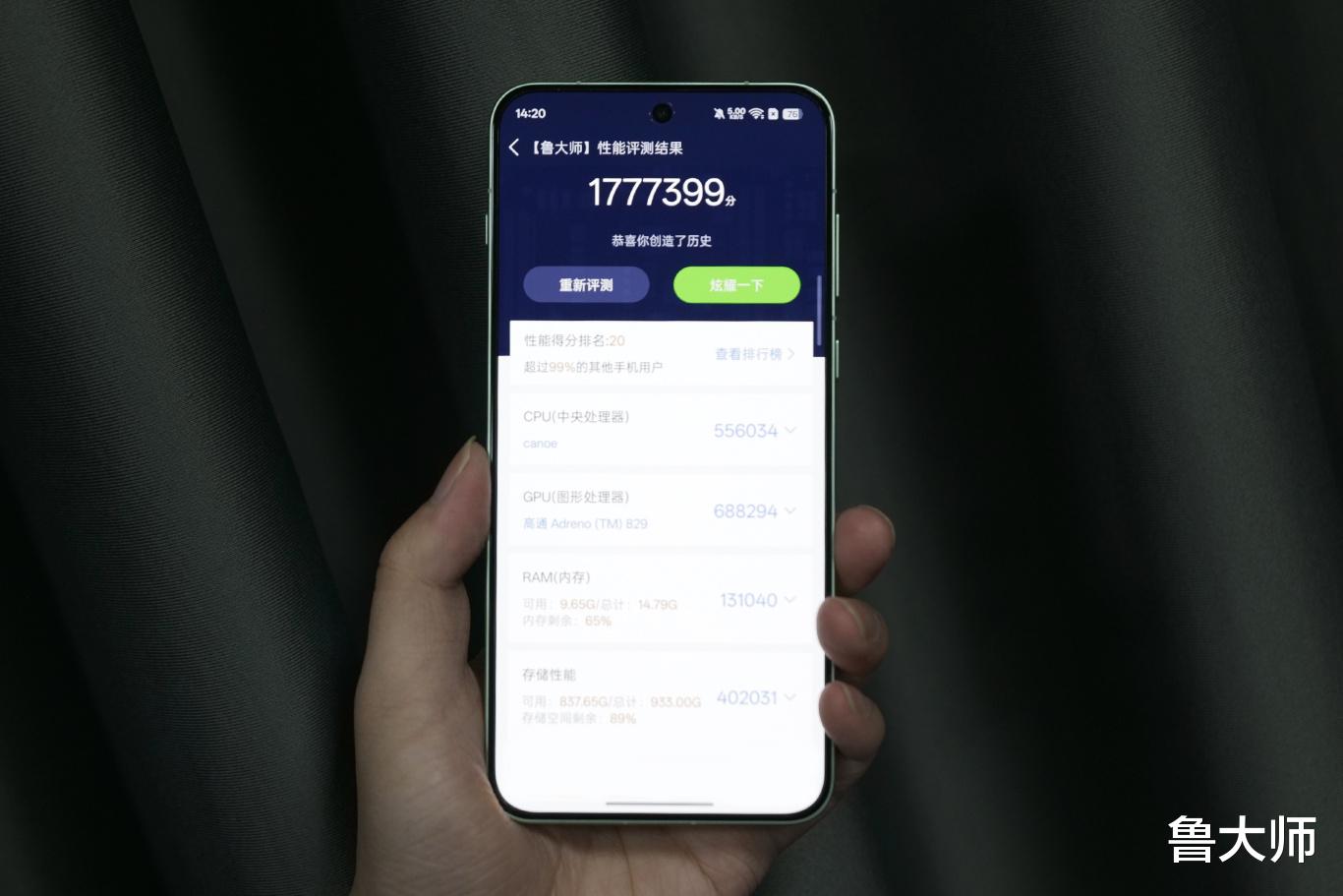 不过这颗8 Gen5采用了同款3nm制程工艺、第三代OryonCPU核心架构,还是跟8 Elite Gen5沾上了点关系的,同时存储规格也给到了9600Mbps的LPDDR5X Ultra内存和UFS 4.1闪存。最终这台Ace 6T在鲁大师性能评测中跑出了1777399分,能和大多骁龙8 lite机器打个五五开。