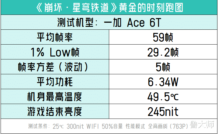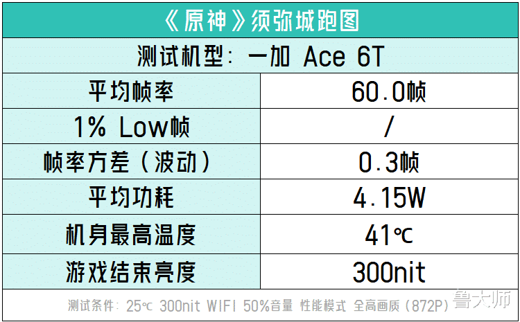 那Ace 6T实际游戏表现够不够看呢?鲁Sir按照惯例先搬上《原神》须弥城跑图,30分钟结束后,可以明显看到Ace 6T帧率线稳得有点过分了?最终平均帧率也是达到60满帧,且帧率方差(波动)仅0.3帧,整机最高温度才41.0℃,平均功耗4.14W,可见Ace 6T散热效率是有两把刷子的。