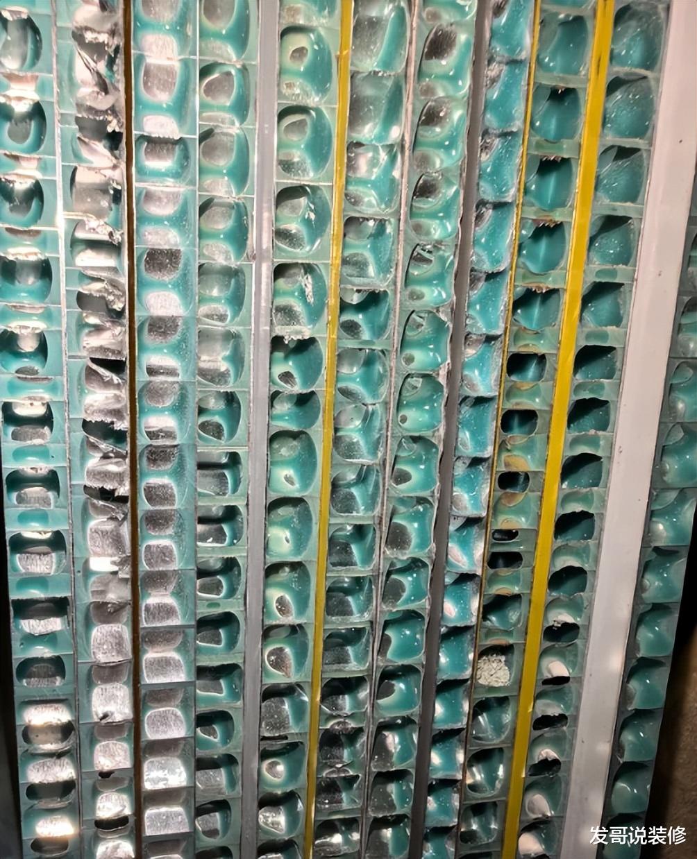 表面看着,蜂窝大板平整、光滑,而且没有接缝,但一块板里,竟然有3分之1都是胶水,你花大价钱做的吊顶,不光造价高,而且不环保,后期维修成本还特别高。