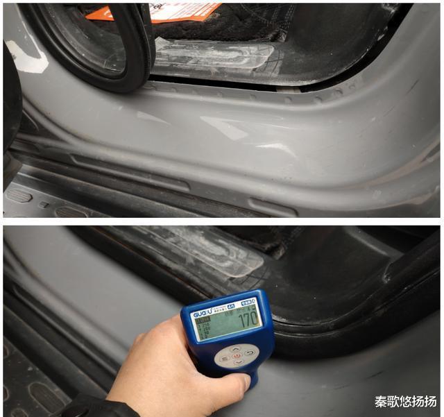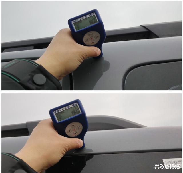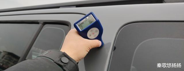 左后C柱外侧漆面亦存在异常,厚度超400微米,最厚处达千多微米,显然经过腻子修复,且异常长度逾8公分。