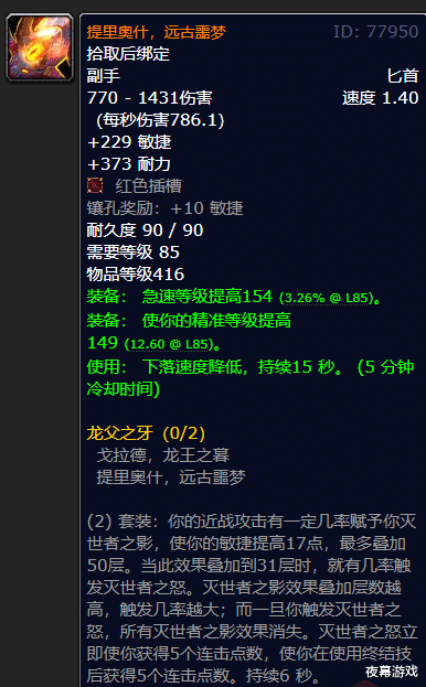 不得不说,在“大地的裂变”资料片中,暴雪实在给予了盗贼太多的福利,不光是增加了回血、免伤等技能,还在4.3版本给予了盗贼一对专属的橙色匕首:龙父之牙。