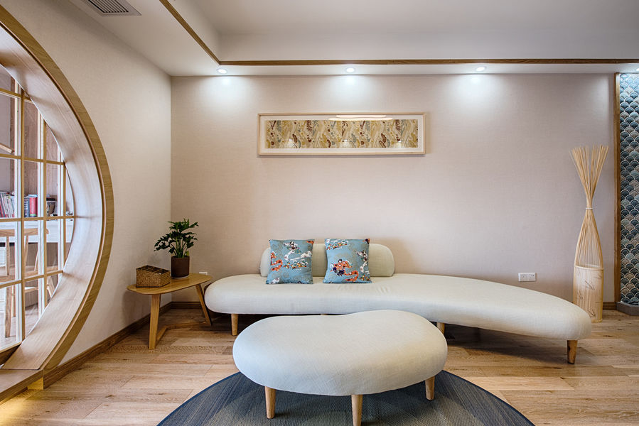 去掉繁复的茶几,铺上素雅的蒲团,再配以简约的灯具、花艺,一个封禅意盎然的客厅就诞生了。